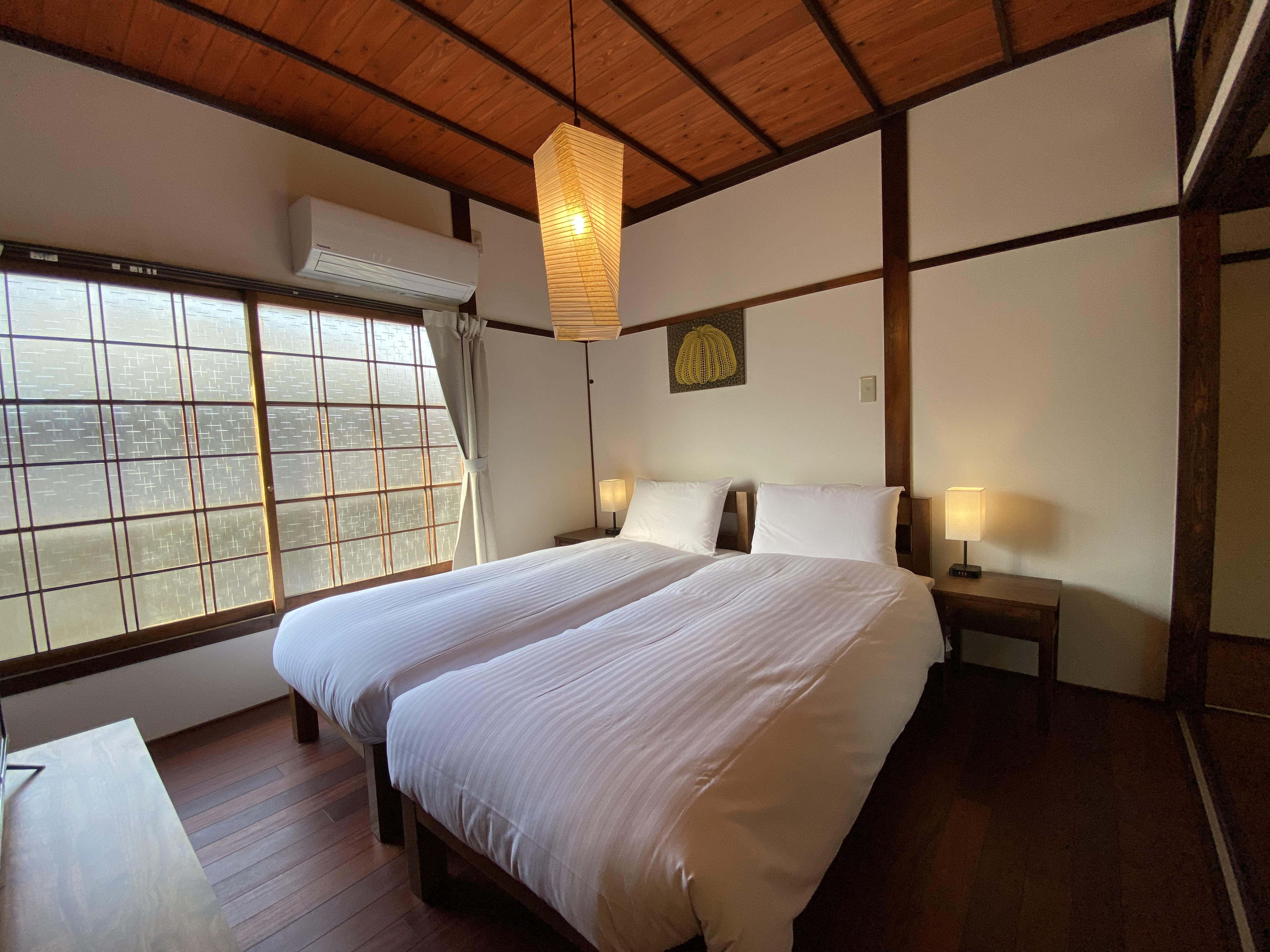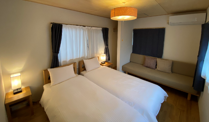 Bed room with 2 single beds , Japanese-style room, Living room, Private bathroom with sauna, shower and toilet.